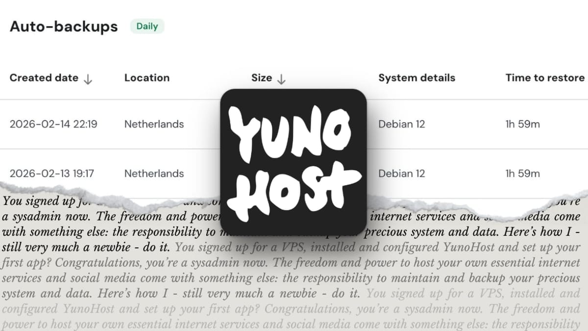 mesa@piefed.social to Selfhosted@lemmy.worldEnglish · 1 day agoA newbie's guide to self-hosting with YunoHost. Part 4: backupsplus-squareblog.elenarossini.comexternal-linkmessage-square29linkfedilinkarrow-up193arrow-down14