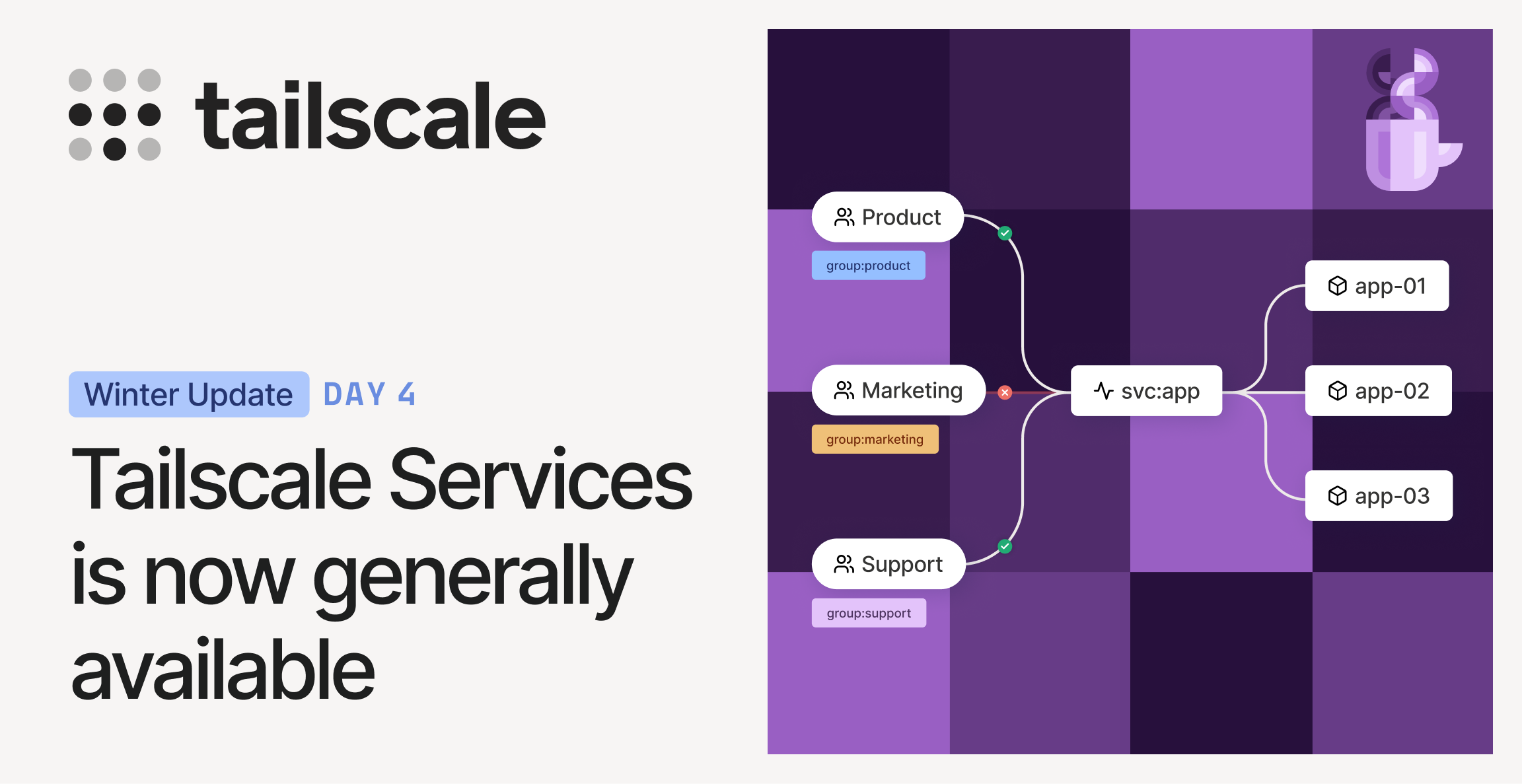 If you’re new to Tailscale Services, it lets you publish internal resources like databases, APIs, and web servers as named services in your tailnet, using stable MagicDNS names. Rather than connecting to individual machines, teams connect to logical services that automatically route traffic to healthy, available backends across your infrastructure. This decoupling makes migrations, scaling, and high availability far easier, without reconfiguring clients, rewriting access policies, or standing up load balancers. Our documentation has details on use cases, requirements, and implementation.