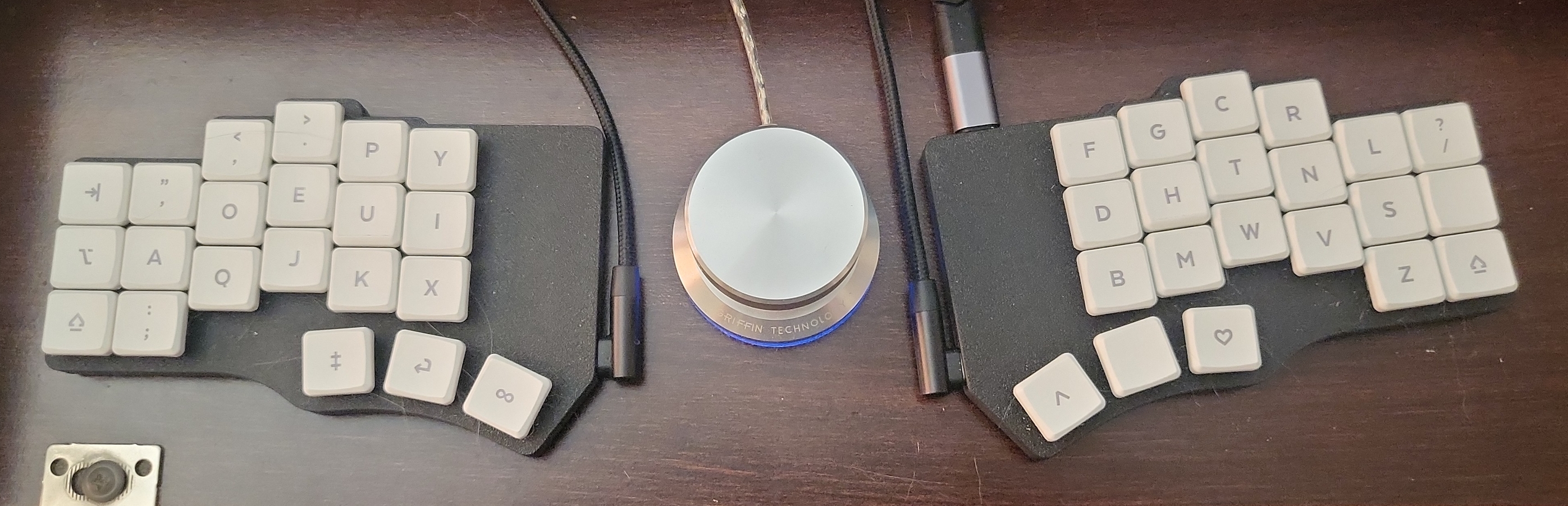 My issue with these is the thumb key placement. The innermost two are fine, but having to tuck my thumb almost into my palm to reach those outer (looking at the keyboards, or inner, if you look at each hand) keys is not very ergonomic for me. It’s also a fairly wide horizontal span to move the thumb, and sequences requiring inner:outer are both tedious and unavoidable.